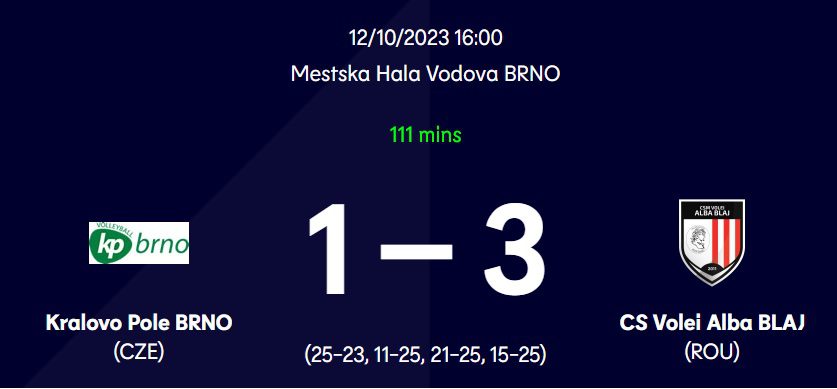 Joi, Alba Blaj a caâștigat în faţa campioanei Cehiei, Kralovo Pole Brno, scor 3-1, pe seturi 23-25, 25-11, 25-21, 25-15 iar în prima partidă, Volei Alba Blaj a învins-o pe formaţia spaniolă CV Gran Canaria, cu 3-0, iar cu cele două succese încheie turneul preliminar pe locul I.