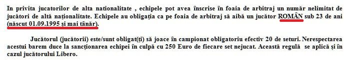„În privița jucătorilor de altă naționalitate, echipele pot avea înscrise în foaia de arbitraj un număr nelimitat de jucători de altă naționalitate. Echipele au obligația ca pe foaia de arbitraj să aibă un jucător ROMÂN sub 23 de ani (născut 01.09.1995 și mai tânăr)”, se specifică în regulamentul campionatului național al Diviziei A1, pentru sezonul competițional 2018-2019 (modificat ulterior).